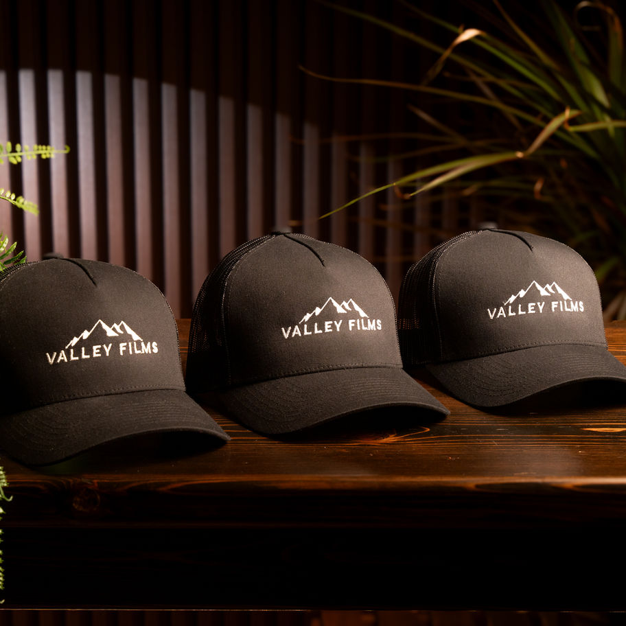 Represent Valley Films in style with this sleek black trucker hat. Featuring an embroidered mountain logo and bold lettering, this cap is the perfect blend of function and fashion. Its breathable mesh back ensures comfort for all-day wear, whether you're on a shoot, exploring the outdoors, or just keeping it casual.